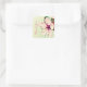 Vista de cerca de la delicada flor del cerezo. Flor rosa pastel con pétalos redondos suaves. El fondo es un verde cal pálido. Gracias escrito en un elegante tipo de letra rosa.