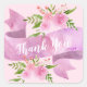 Mujer y bonita etiqueta cuadrada rosa claro con las palabras "Gracias" en una elegante escritura blanca, con un fondo de cinta de lavanda púrpura. Dos hermosos arreglos florales de acuarela primaveral con rosas rosadas y vegetación completan el diseño.
