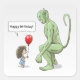 La chica le dice feliz cumpleaños a su amiga el gran goblin verde.