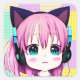 Chica kawaii con audífonos y orejas de gato pegatinas de fondo de arte pop rosa y azul.