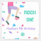 Rock! La pared de escalada con agujeros coloridos está en una textura acuática divertida. El texto dice "Rock On" con espacio para el chica de cumpleaños o el mensaje del niño debajo. Pegatinas perfectos para una fiesta de cumpleaños con tema de escalada en roca/