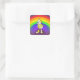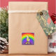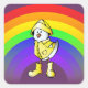 Una linda chica vestida con un abrigo de arco iris, botas y gorras parados frente a un arco iris.