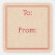 Simple elegant gift tag labels featuring the text “to” and “from" in a red, elegant serif font surrounded by a traditional double border. The background is a printed image of rustic brown Kraft paper.