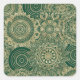 Elegante y caprichoso diseño único de colección de mandalas tribales purpurinas de oro falso, henna de faja india, lleno de puntos, formas geométricas, líneas, rayas, triángulos, círculo de flores, oro amarillo, puntos brillantes, imagen mística abstracta, sobre un fondo de color verde-bosque. Una decoración mística, azteca, lux, ilustracion verde y dorado, imagen impresa.