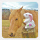 Pegatina Cuadrada Conejo blanco y caballo amarillo rubio