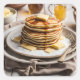 Una pila de crepes con mantequilla y jarabe.
