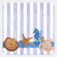 Diseño original pintado en acuarela por Sandra Gale, con estrellas de pescado, caballo de mar, tortuga y conchas sobre un fondo de rayas azules translúcidas verticales. Excelente diseño para el verano, casas de playa, bungalows o para todo aquel que ame la playa, el océano o el pescado.