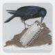 Un dibujo a lápiz de color de un curioso cuervo que investiga una armonica brillante que ha encontrado.