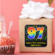 Este divertido, colorido y vibrante diseño pegatina de cumpleaños presenta un gran número "97" con un diseño inspirado en el gradiente del espectro arcoiris. También incluye el mensaje "Feliz cumpleaños 97", y un nombre personalizado. Parte del fondo tiene un patrón de símbolos y notas musicales coloridas. Pegatinas divertidos y editables de cumpleaños como este podrían ser usados como decoración para celebrar el cumpleaños, o tal vez como regalo de cumpleaños, o tal vez se usen para envolver regalos de cumpleaños que se dan para celebrar a un cantante, un compositor de canciones, un músico, o el cumpleaños 97 de alguien más. [~Z0000423]