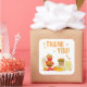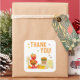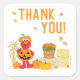 Añade un toque festivo a tu celebración de otoño con este adorable pegatina de agradecimiento que presenta a Elmo vestido con un alegre disfraz de calabaza de linternas jack-o'. El Elmo, rodeado de un fondo blanco con hojas de otoño de colores dispersas, está rodeado de detalles estacionales de cosecha como calabazas, balas de heno, tallos de maíz y una canasta de madera llena de flores naranjas. El naranja audaz "¡Gracias!" hace de esto el pegatina perfecto para sellar bolsos de favores, tarjetas o fiestas en una celebración de cumpleaños con tema de otoño.
