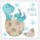 Pegatinas de cumpleaños del niño de 1 año con tema de dinosaurio con un adorable tiranosaurio rex saliendo de un huevo con huellas de dinosaurio azules. Perfecto para celebraciones temáticas de "fiesta de dino" y "uno salvaje". Arte de KL Stock
