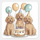 Ilustracion personalizado de perros de Goldendoodle con un gorra de cumpleaños rodeando una torta de cumpleaños y globos. Perfecto para los amantes de las mascotas o los padres de perros.
