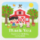 Esta pegatina divertida y linda presenta a una chica de pelo negro y piel clara junto a un granero rojo con una veleta de gallo. Hay adorables animales de granja como una vaca, un cerdo y una gallina. Al fondo hay un cielo azul brillante, manzanos, sol, mariposas y margaritas. El texto combina fuentes en negrita y sans serif para un estilo moderno y elegante. Esto es perfecto para una fiesta de cumpleaños con tema de granja.
