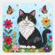 Pegatina Cuadrada Cute Black and White Cat, Flowers and Butterflies