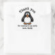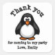 Pingüino blanco y negro lindo en blanco "Gracias por venir a mi fiesta". pegatina de la fiesta de cumpleaños. Personaliza con el nombre del niño de cumpleaños y usa en bolsas de regalo y sobres de "Gracias".