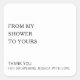 Pegatinas modernas para el shower de la novia en negro y blanco con un diseño minimalista que incluye las palabras "De mi shower a la tuya" y su mensaje de agradecimiento. Estas sencillas pegatinas son ideales para la novia minimalista.