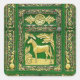 Fotografía de una tradicional caravana gitana pintada de caravana con un caballo de oro sobre un fondo pintado de verde, fotografiada en la feria de caballos Appleby, en Cumbria, Inglaterra, donde los gitanos se reúnen cada año.