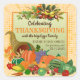 Celebra el día de Acción de Gracias con este diseño que presenta una cornucopia o cuerno de abundancia lleno de todas tus verduras caídas favoritas, grano y fruta: bayas de ceniza de montaña, trigo, calabaza, pimiento, maíz, zanahoria, papa, manzana, uva, higo, alcachofa, sandía, fresa, kiwi, tomate y col. Encima hay un acuerdo de otoño con bellota, castaño, bayas y follaje de otoño variado. Reemplace el texto de ejemplo con el suyo propio para un diseño personalizado.