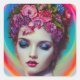 Un hermoso retrato artístico de una mujer en un gorra de flores, rodeado por un aura arcoiris. Sería una bella adición a un boudoir o a un dormitorio de chica.
