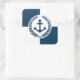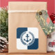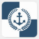 Diseño de temática náutica con decoración de coronas de ancla y laurel sobre fondo geométrico azul y blanco