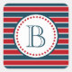 Diseño de temática náutica con decoración monográfica en forma redondeada con estrellas de fondo rayado azul, rojo y blanco