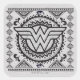 El clásico logo de la Mujer Maravilla envuelto en un cuadrado de diseños espirituales ornamentales y florecientes.