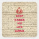 Una divertida postura humorística sobre el popular lema de "mantener la calma" con un tema budista. "Mantener Karma y vivir Longa" texto rojo en un antiguo ilustracion de libros de Buda en un fondo de papel vintage.