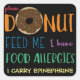 Personalizado Donut Feed Me Tengo Alergias A Alimentos Niños Pegatinas. Personalizado con su nombre, indique sus alérgenos o haga saber a otros que lleva epinefrina. Editar para decir "epinefrina dentro" y adjuntar a los kits de medicamentos. El fondo negro puede cambiarse a otro color. El texto dice por favor NO me alimente, tengo alergias a alimentos. Chocolate roció donut en el centro de O en donut. Pegatinas de alerta de alergia divertida para niños. Diseños de Lil Allergy Advocates www.lilallergyadvocates.com