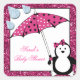 Un pingüino súper lindo con puntos de polka rosado con corbata de arco y con puntos de polka y paraguas de estrellas con lluvia purpurinoso cayendo, pero cuando el sol amarillo brillante purpurinoso sale, el paraguas se ha ido. ¡Poof! Perfecto para una ducha de chica.