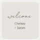 Pegatina de boda 'bienvenida' elegante y chic, con los nombres de la pareja en una fuente contemporánea de tonos neutros y negros sobre un fondo gris paloma chic. Este artículo forma parte de una suite de boda que contiene invitaciones y papelería en una variedad de artículos neutros para mezclar y combinar.