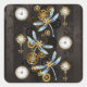 Pegatina Cuadrada Dragoniscos de Steampunk sobre fondo rayado marrón