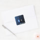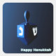 Un modernístico dreidel azul metálico contra un fondo oscuro y nocturno. Dos de las letras hebreas encontradas en un dreidel, una monja y un shin, brillan brillantemente. El texto que dice "Feliz Hanukkah" también aparece en azul brillante y blanco.