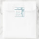 Este pegatina cuadrado con ducha de novia presenta un diseño que parece un regalo elegante. El fondo es de color verde azulado polvoriento con un patrón de punto blanco y el pegatina tiene un gráfico de una polvorienta cinta verde azulada atada en un arco. El centro del pegatina es de color blanco y cuenta con un texto de personalizable para el nombre de la novia y la fecha de la ducha.