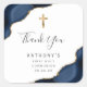 Este pegatina de agradecimiento de la Primera Comunión presenta diseños de agatos de color azul marino recortados con falsos purpurinas de oro en dos esquinas. Una cruz de Relieve metalizado falsa de oro aparece encima de las palabras "Gracias" en escritura a mano gris carbón sobre fondo blanco. Personalízalo con el nombre del invitado de honor, la ocasión y la fecha en letra de copperplate gris de carbón.