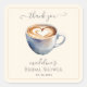 La encantadora ducha de novia con tema de café gracias pegatina cuadrado. ¡La taza de café tiene un corazón de espuma! La asombrosa caligrafía de escritura añade al aspecto. Un diseño maravilloso para tu ducha de café con novia. Vea la coordinación de artículos en nuestra tienda, Enchanted Finch.
