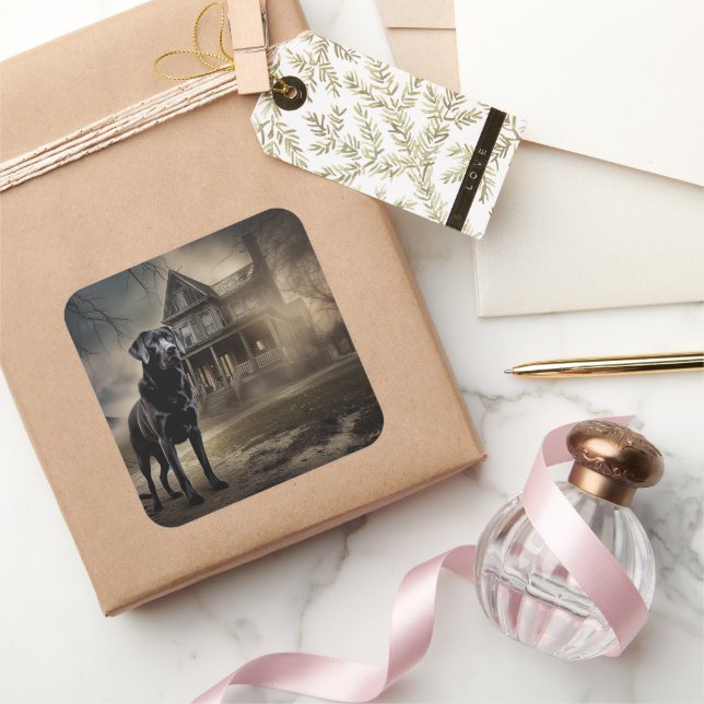 Pegatina Cuadrada El miedo de Halloween en el Labrador Negro