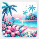 El arte píxal parece un punto de inflexión que representa la imagen de un océano azul, palmeras y flores tropicales rosas.