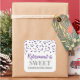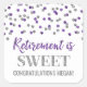 El retiro es un pegatina de etiquetas con favores dulces con un patrón de confetti morado y plateado.