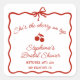 Este diseño pegatina de "Ella es la cereza en la cima" trae un juguetón de personalidad a cualquier celebración nupcial. Con letras rojas audaces en un guión caprichoso, está enmarcado con un borde ondulado dibujado a mano y coronado con un arco delgado. En el centro, un dulce par de cerezas aporta un toque divertido de inspiración retro. El diseño está decorado con un fondo blanco y nítido, por lo que las obras de arte rojas destacan de forma magnífica. Perfecto para sellar bolsos de bienvenida, regalos decorativos o para añadir un detalle elegante a las invitaciones. Personalizable completo con nombres, fechas o un mensaje corto para ese acabado extra dulce.