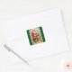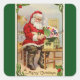Santa está sentada en un taburete y pintando una casa de juguete o una casa de muñecas. Saludo: Feliz Navidad. Imagen de una tarjeta de Navidad Vintage en un fondo verde lima muy oscuro.