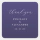 This square sticker features an elegant design with a deep purple background and white text, creating a striking contrast. The layout includes a flowing cursive script for the phrase "thank you" at the top, followed by clean, uppercase serif fonts for customizable names and date placeholders. The minimalist style emphasizes gratitude and celebration, making it perfect for formal events like weddings or thank-you notes. Its sophisticated typography and balanced composition convey warmth and appreciation in a stylish manner.