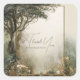 Step into a realm of serene, rustic magic with this enchanting forest thank you sticker. The design features a stunning, painterly illustration of a tranquil woodland clearing, rendered in a sophisticated, muted earthy palette. A majestic, ancient tree with detailed, gnarled bark stands proudly on the left, its branches reaching towards the soft, misty background where distant forests fade into fog. The foreground is rich with intricately drawn undergrowth, featuring ferns, sage green leaves, delicate cream and rust-colored wildflowers. A magical dusting of subtle gold glitter adds a touch of enchantment. A minimalist, thin, textured gold glitter rectangular frame provides an elegant border for your message within the light, airy center. These stickers are perfect for businesses with a natural, rustic, or artistic aesthetic, such as artisans inspired by nature, boutique stationers, fantasy authors or illustrators, rustic wedding venues, or landscape photographers. This versatile design can also be used to beautifully seal envelopes for woodland-themed weddings, formal events, or as a sophisticated accent on party favors and gift wrapping.