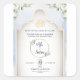 Celebra tu día especial con gracia y tradición usando esta hermosa tarjeta de invitación a la boda islámica. El diseño presenta una elegante caligrafía árabe de "Bismillah ir-Rahman ir-Rahim", enmarcada en un delicado arco de estilo mezquita con suaves acentos florales y detalles dorados.