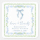 Elegantes stickers de agradecimiento para la despedida de soltera para tus favores de fiesta y tarjetas de agradecimiento con marcos de acuarela florales azules y verdes escama vintage inspirados en la era grandmillenial, un delicado lazo azul coquette de acuarela, "amor + gracias" presentado en una elegante caligrafía azul, y el nombre de la novia y la fecha de la despedida en tipografía serif clásica.