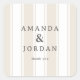 Esta pegatina para bodas presenta un diseño clásico y elegante con rayas verticales beige y blancas, creando un fondo sutil pero sofisticado. La tipografía es el punto focal, mostrando fuentes serif negritas para los nombres "Amanda & Jordan" y una fuente más pequeña y ligera para "gracias", transmitiendo calidez y agradecimiento. La paleta de colores suaves de beige suave y blanco crujiente realza su atractivo atemporal, lo que la hace perfecta para expresar gratitud en bodas u otros eventos formales. Sus líneas limpias y amplio espacio negativo garantizan la legibilidad al tiempo que mantienen una elegancia discreta ideal para cualquier ocasión sincera.