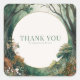 Step into a fairytale world with this enchanting forest thank you sticker. The design features a stunning, painterly landscape of a magical woodland clearing, rendered in a rich, earthy palette of deep greens, browns, and rustic oranges. Majestic, ancient trees with detailed bark form a natural arch, framing a central space. The lush forest floor is depicted with abundant undergrowth, ferns, and delicate white wildflowers. A subtle scattering of tiny gold sparkles adds a touch of magic throughout the scene. At the center, a clean white circle provides a perfect backdrop for your message, elegantly enclosed by a thin, sparkling gold glitter border. These stickers are perfect for businesses that evoke nature, storytelling, and rustic charm, such as fantasy authors or illustrators, rustic wedding venues or planners, artisanal craftspeople, nature photographers, or boutique bookstores. This versatile design can also be used to beautifully seal envelopes for woodland-themed weddings or parties, or as a sophisticated accent on party favors and gift wrapping.