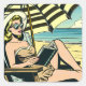 Arte de historietas de arte pop negro y amarillo estilo ai, que representa a una mujer leyendo un libro en la playa con gafas de sol y usando un sombrero de sol bajo un paraguas.