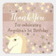 Agrega un toque mágico al primer cumpleaños de tu pequeña con esta etiqueta de agradecimiento de unicornio rosa y dorado! Con un patrón de estrellas brillantes, fondo rosa y dorado brillante, y una dulce ilustración de unicornio. Perfecto para sellar bolsas de favores, sobres o cajas de regalo en una celebración de cumpleaños número 1.
