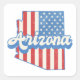 Pegatina cuadrada patriótica con estrellas y franjas de EE. UU. que rellenan la silueta del estado de Arizona, con texto de estilo retro..