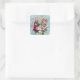 Pegatinas cuadrados con la versión coloreada de Alicia en el Conejo Blanco de la Tierra de las Maravillas como miembro de la Corte de la Reina de los Corazones. Añadido floral sobre fondo azul angustiado. Perfecto para fiestas de té Mad Hatter y otros eventos caprichosos.
